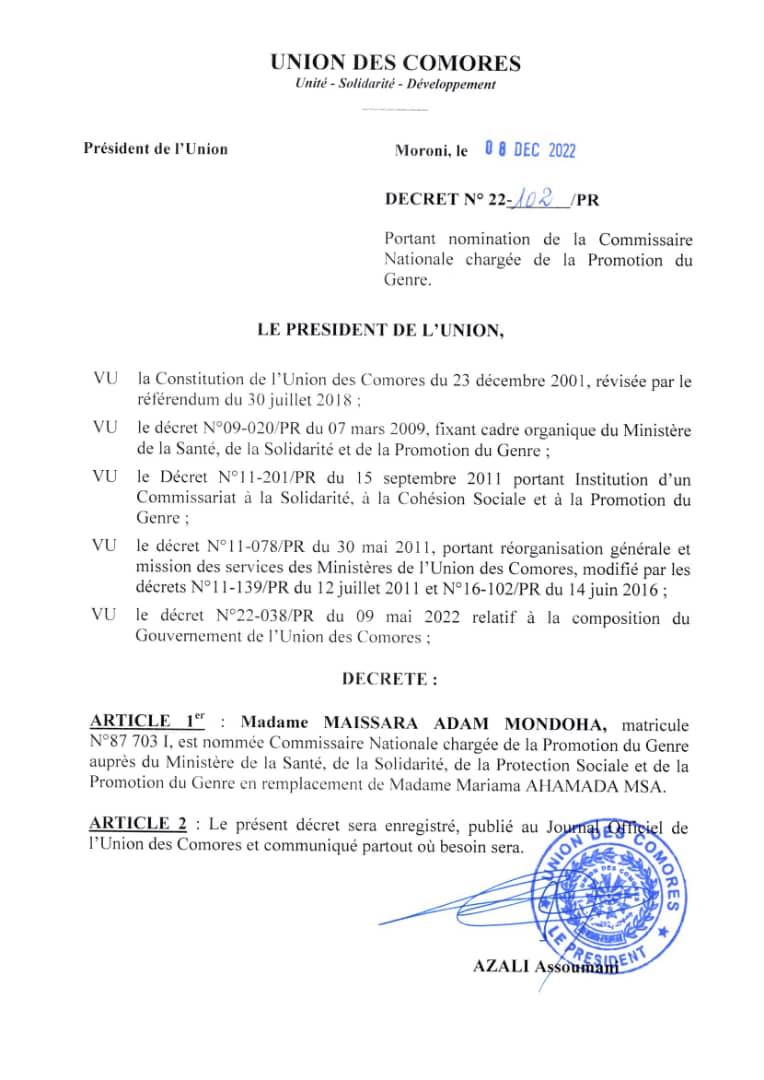 Portant nomination de la Commissaire Nationale chargée de la Promotion du Genre
