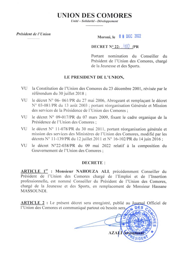 Décret N°22-100/PR du 08 Décembre 2022 Portant nomination du Conseiller du Président de l'Union, chargé de la Jeunesse et des Sports