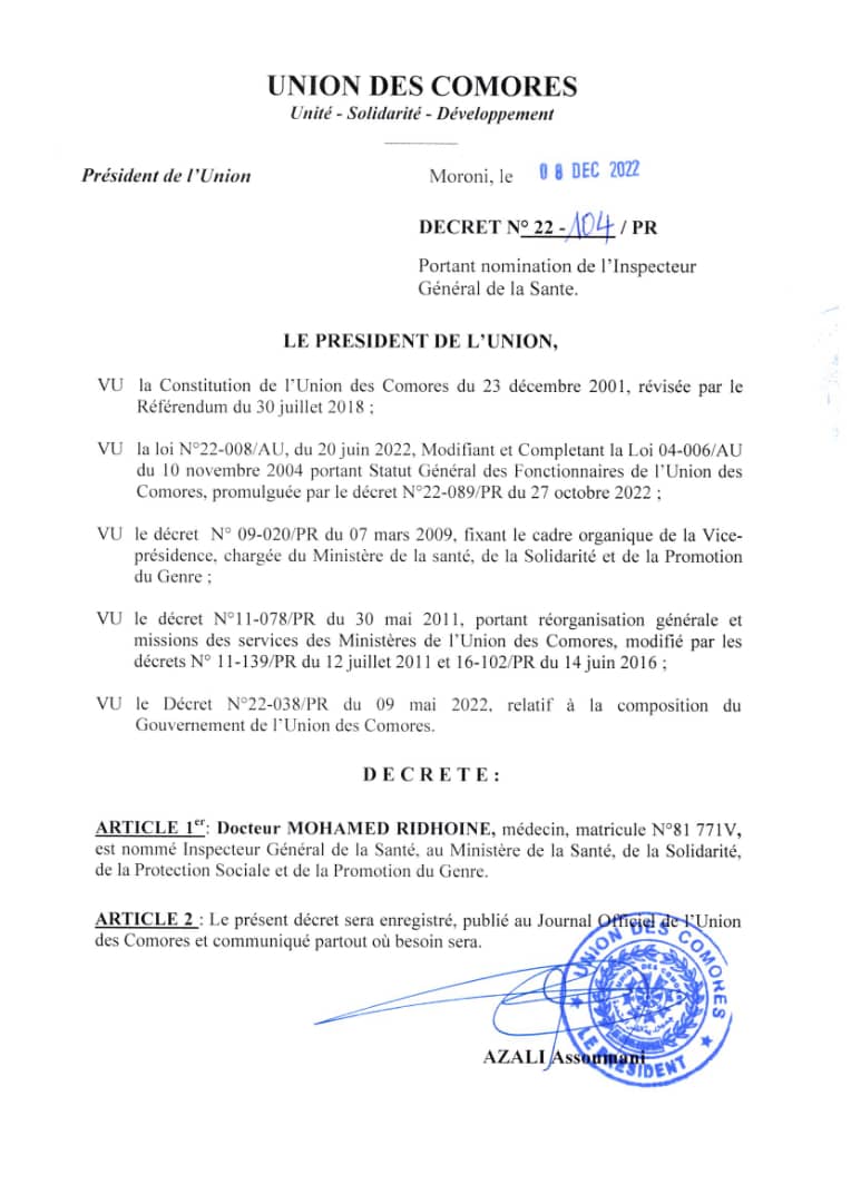Décret N°22-104/PR du 08 Décembre 2022