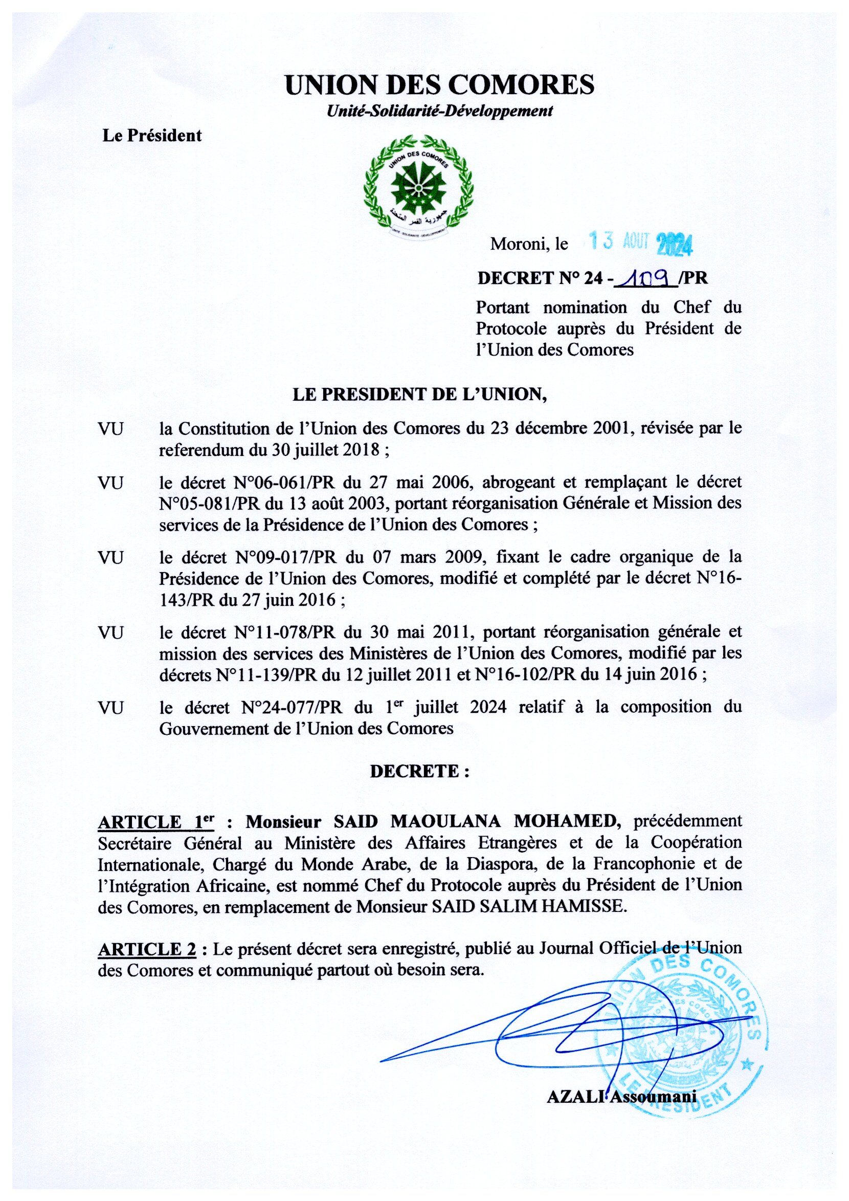 Décret N°24-109PR du 13 aout 2024 portant nomination du Chef du Protocole aupres du Président de l'Union