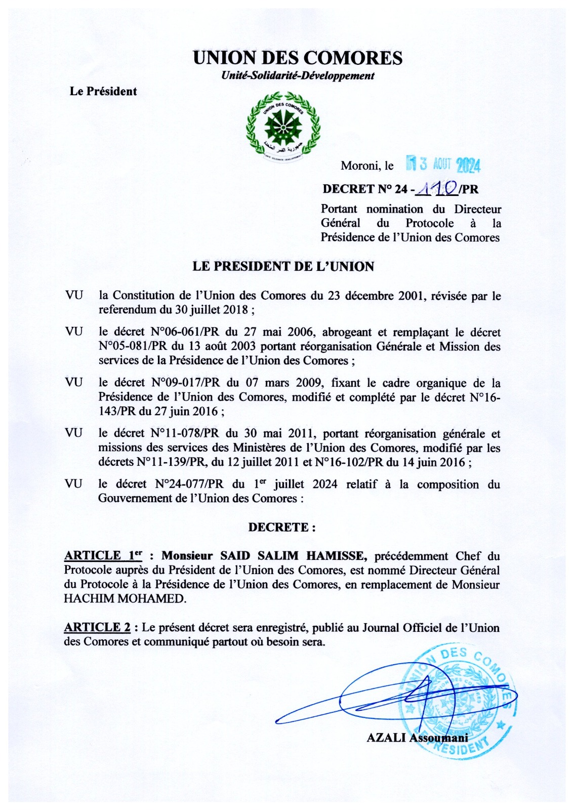 Decret N°24-110PR du 13 aout 2024 portant nomination du Directeur Général du Protocole à la Présidence de l'Union
