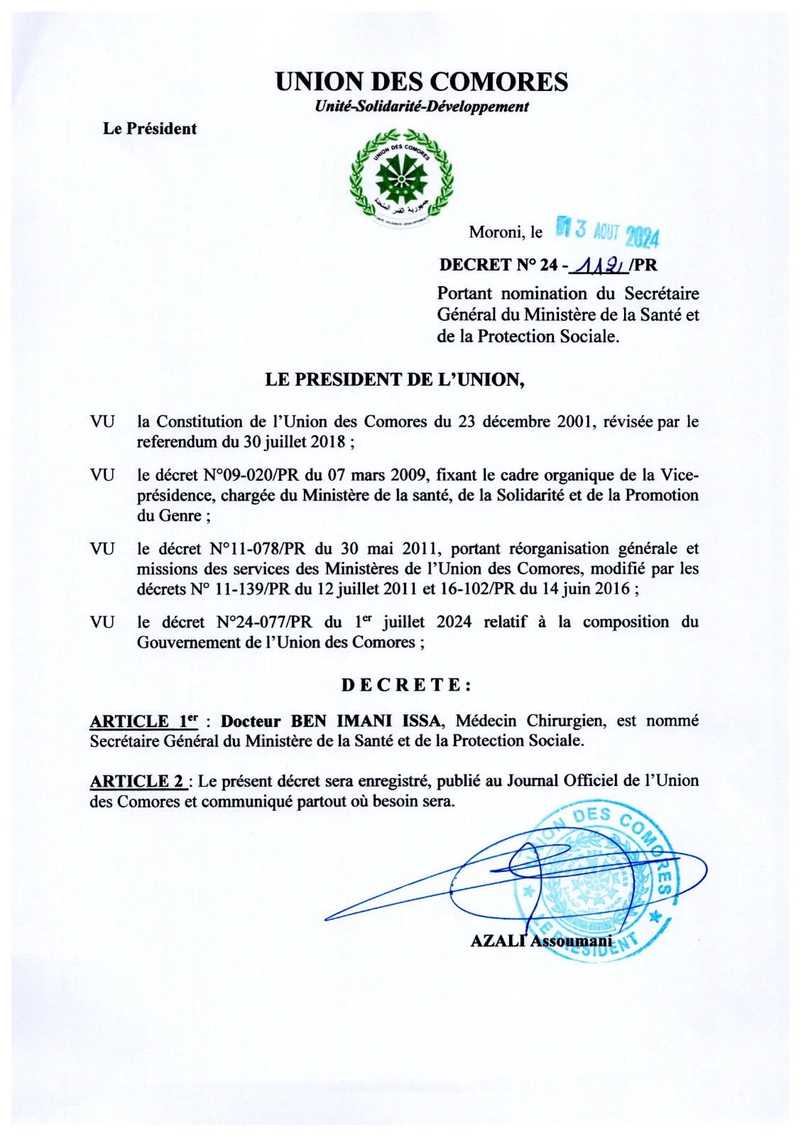 Decret N°24-112PR du 13 aout 2024 portant nomination du SG Minsitère d ela Santé et de la Protection sociale