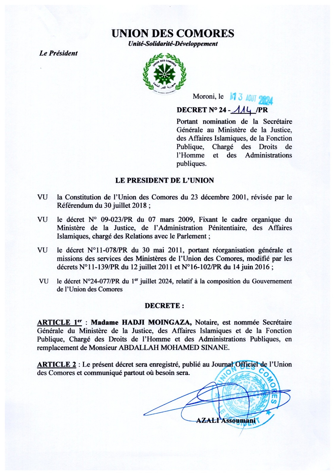 Decret N°24-114PR du 13 aout 2024 portant nomination du SG Ministère de la Justice