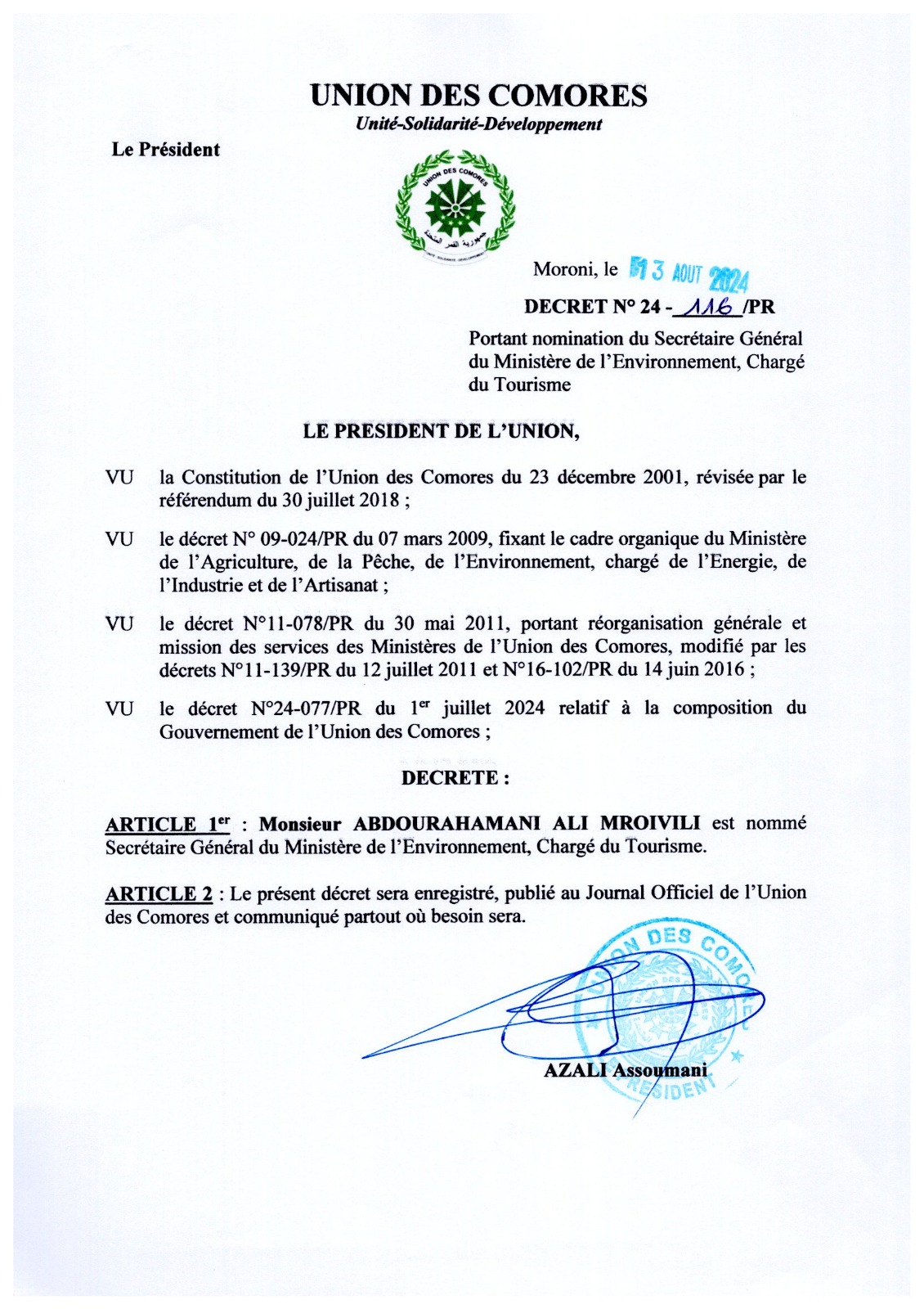 Decret N°24-116PR du 13 aout 2024 portant nomination du SG Ministère de l'Environnement chargé du Tourisme