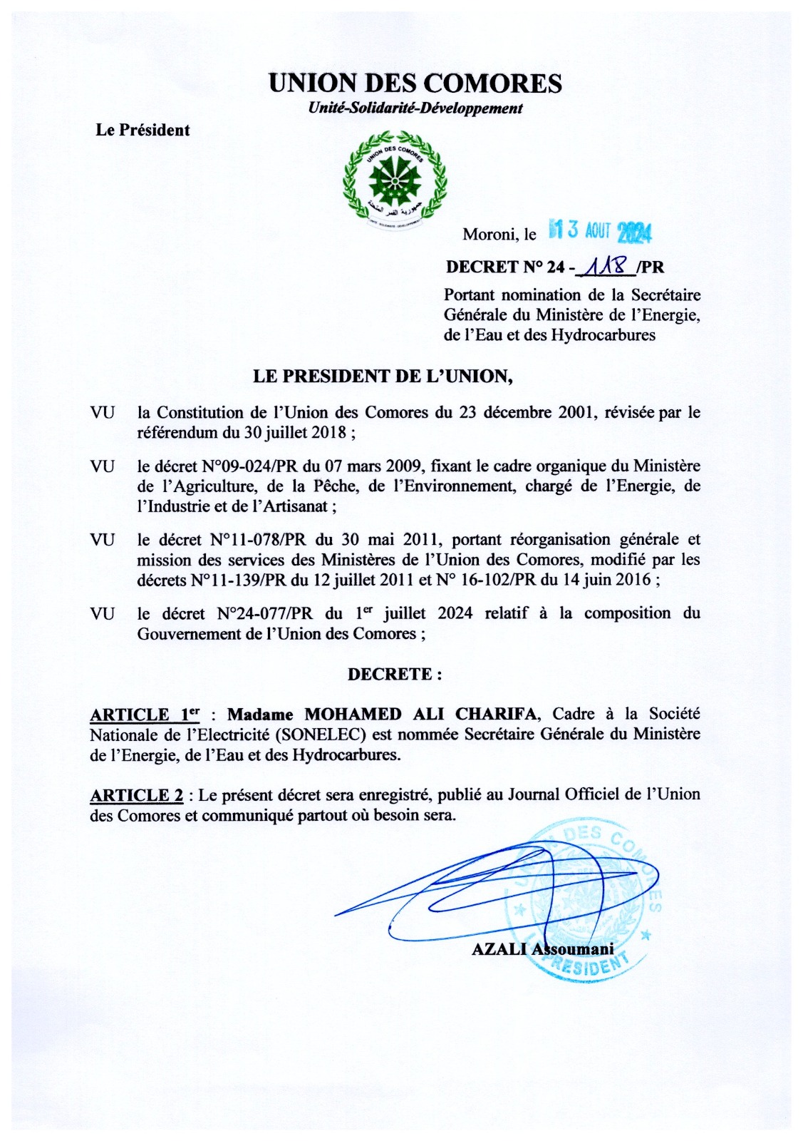 Decret N°24-118PR du 13 aout 2024 portant nomination du SG Ministère de l'Energie, de l'Eau et des Hydrocarbures