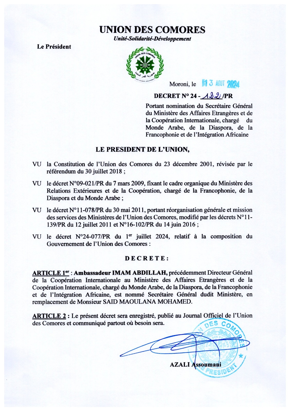 Decret N°24-122PR du 13 aout 2024 portant nomination du SG Ministère des Affaires Etrangère et de la Coopération Internationale