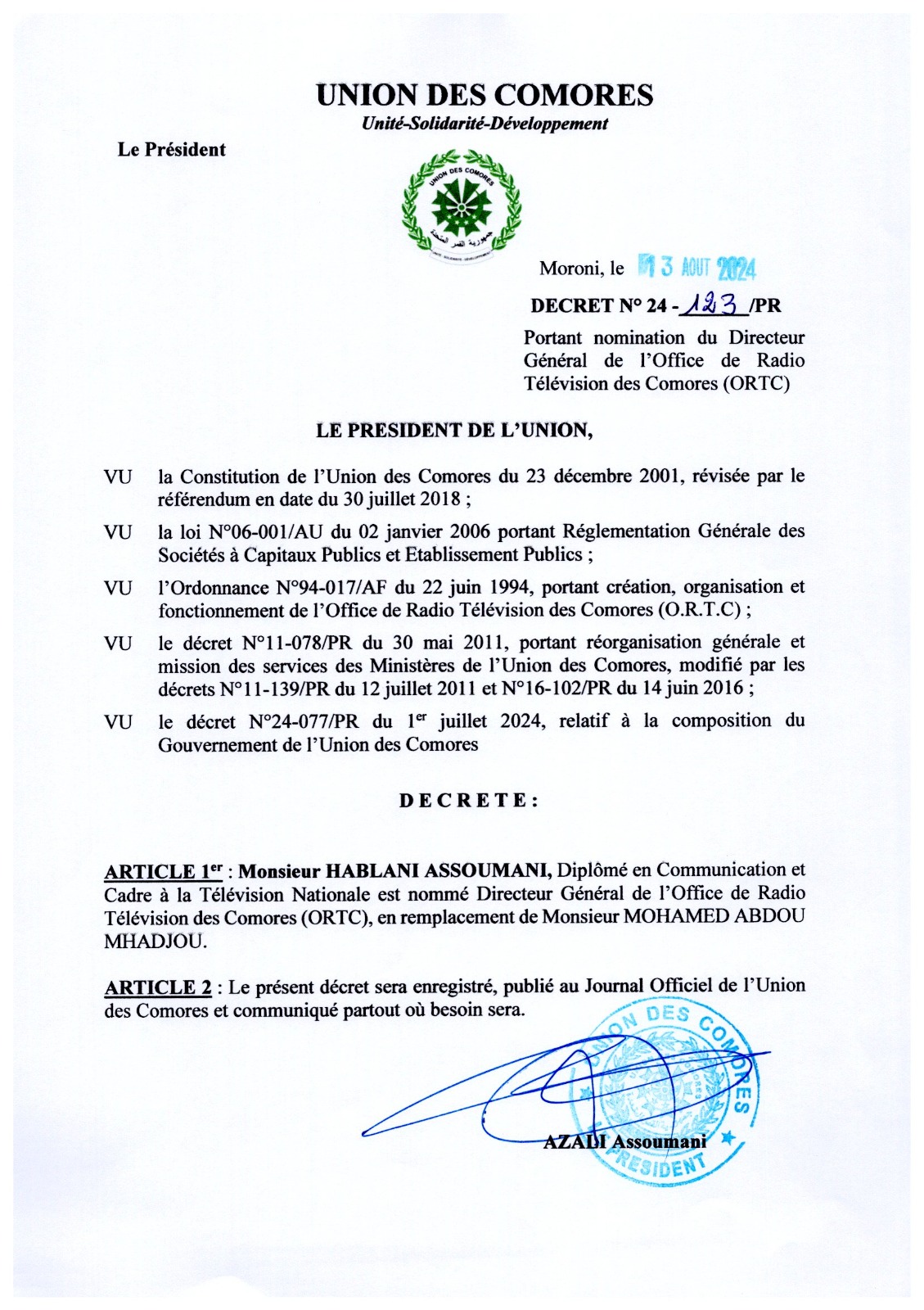 Decret N°24-123PR du 13 aout 2024 portant nomination du DG ORTC
