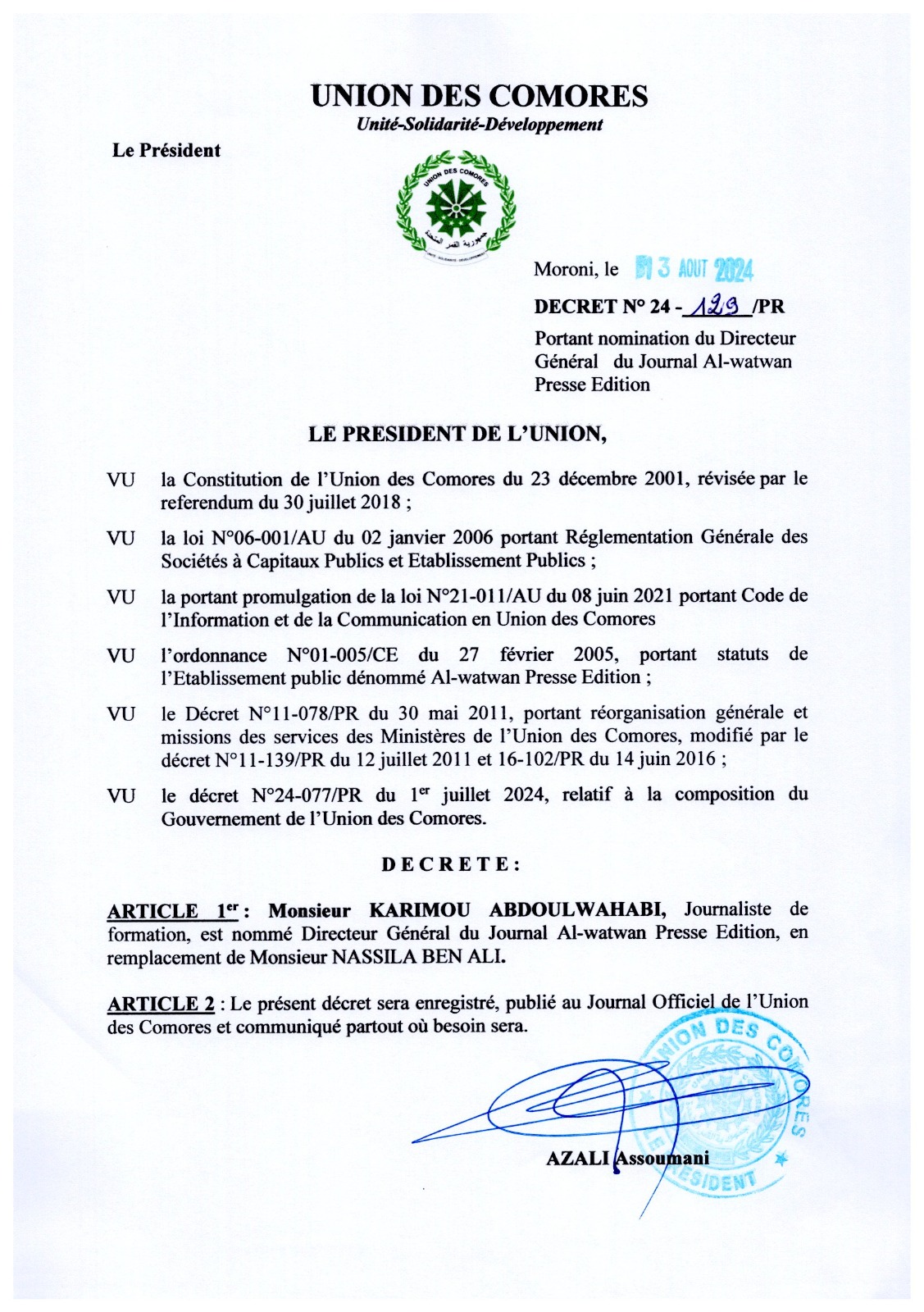 Decret N°24-129PR du 13 aout 2024 portant nomination du DG du Journal Al-watwan
