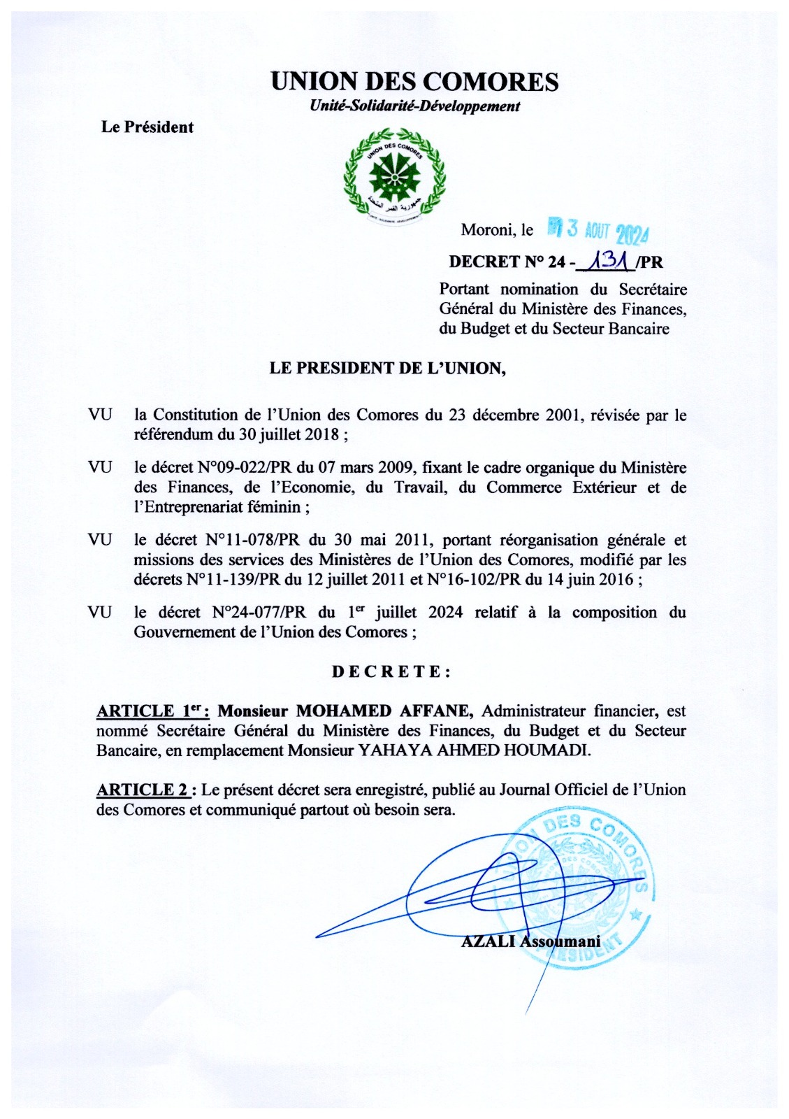 Decret N°24-131PR du 13 aout 2024 portant nomination du SG Ministère des Finances, du Budget et du Secteur Bacaire