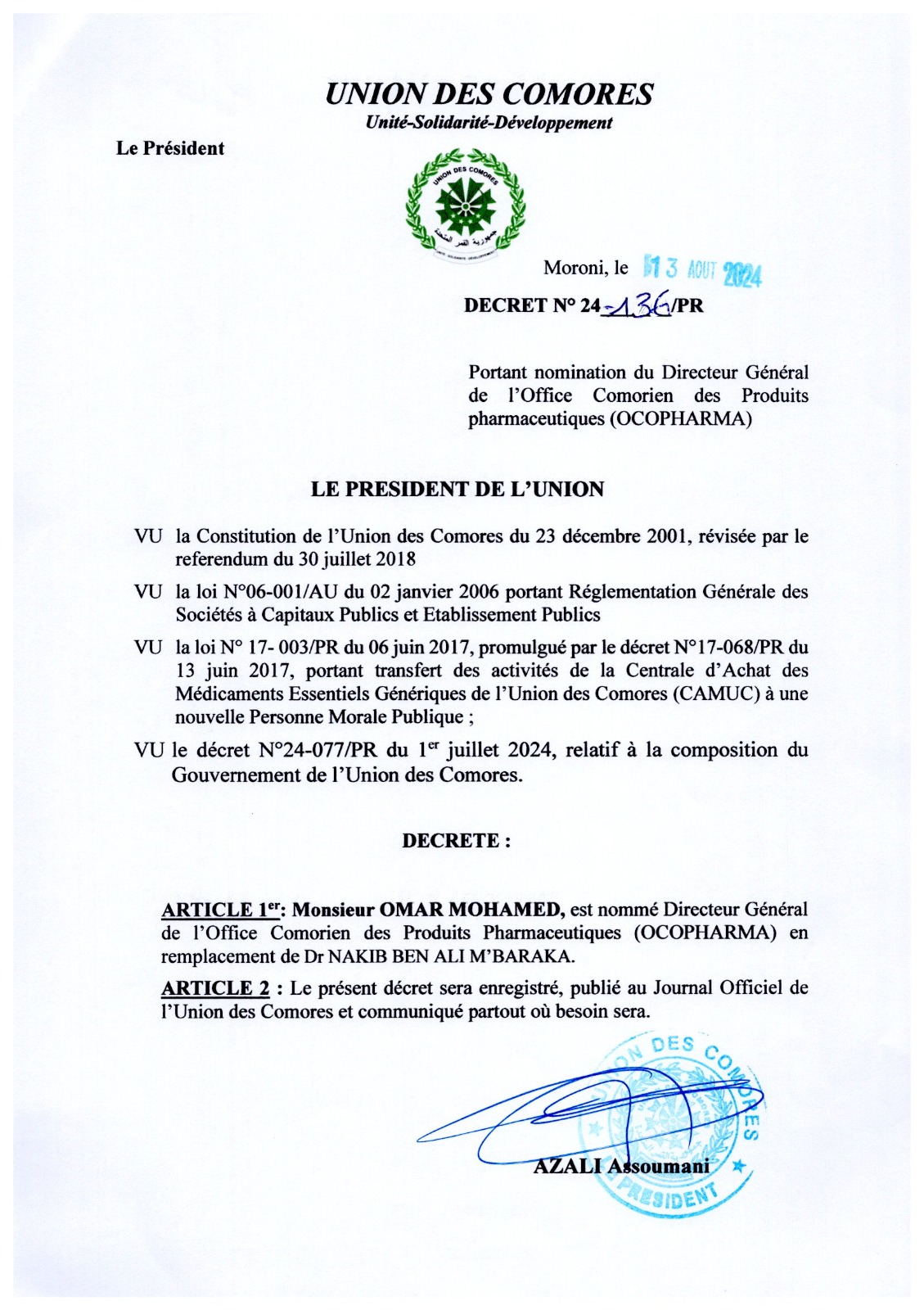 Decret N°24-136PR du 13 aout 2024 portant nomination du DG OCOPHARMA